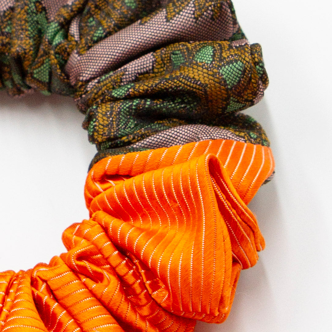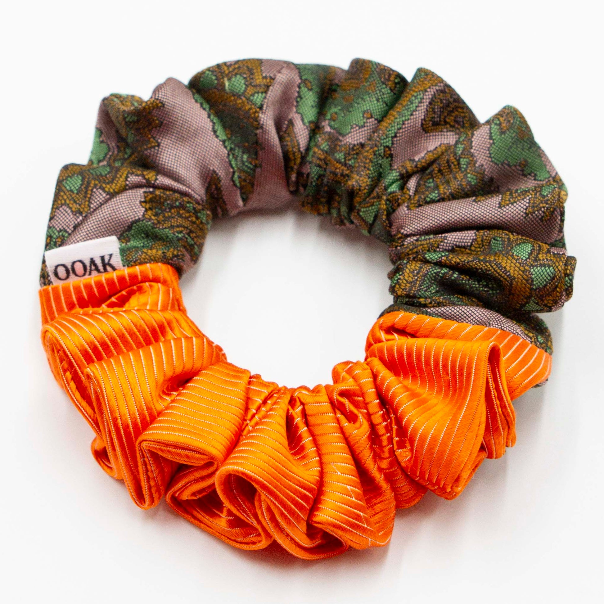 This delicate colorblock scrunchie is made from two preloved ties and carefully finished by hand.