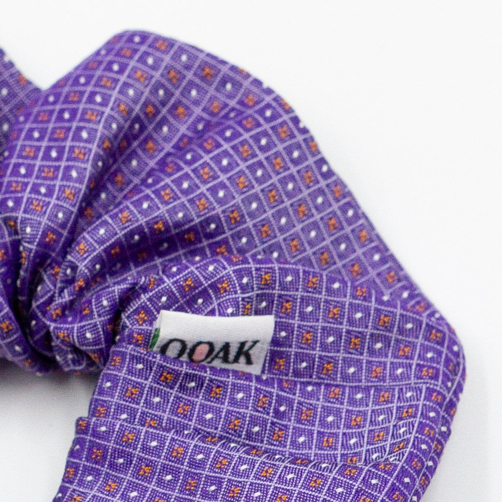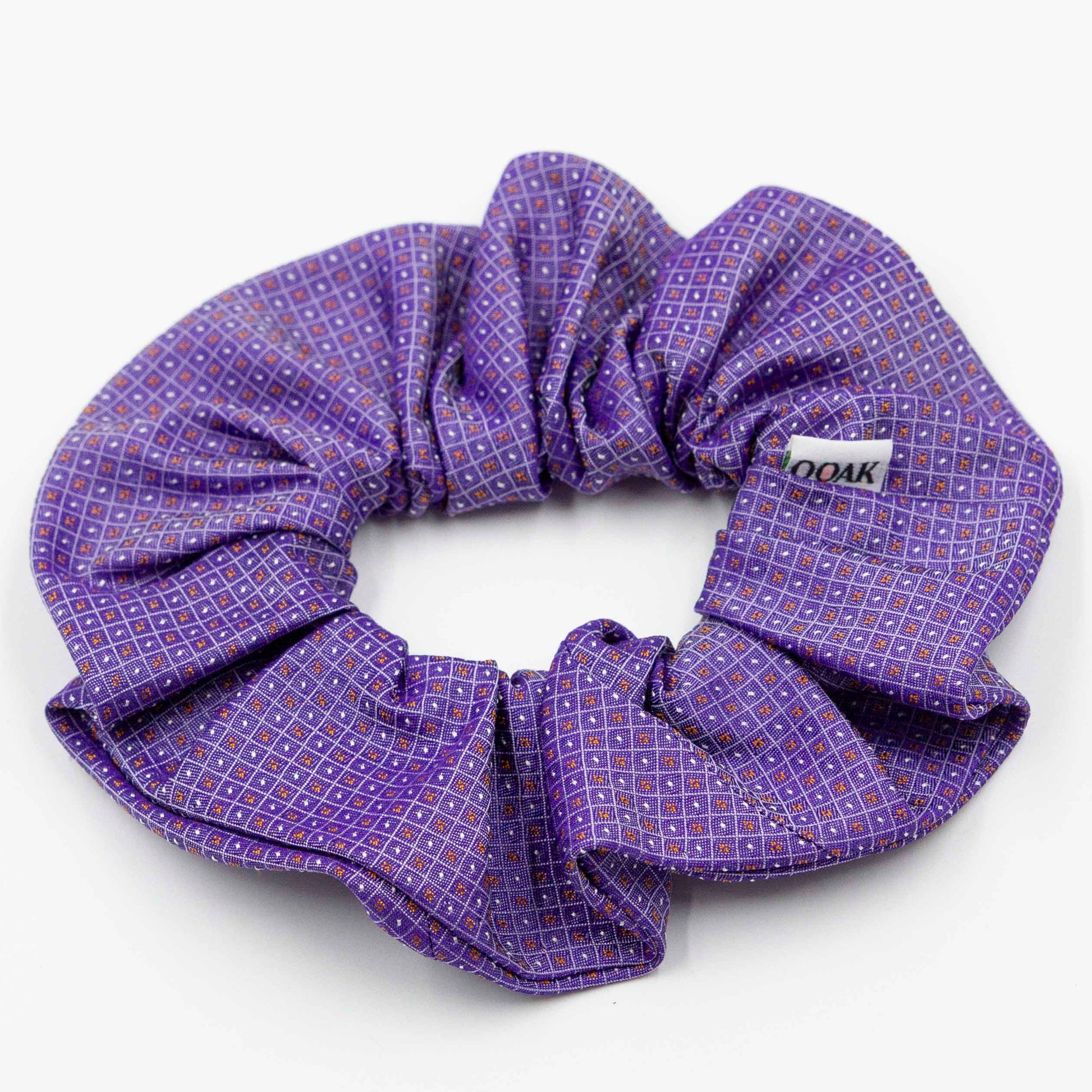 Fun fact: this scrunchie is truly One Of A Kind, there is only 1 of them. The volume of the scrunchie is determined by the fashion trends of the period in which the tie was made, and whether the tie was narrow or wide