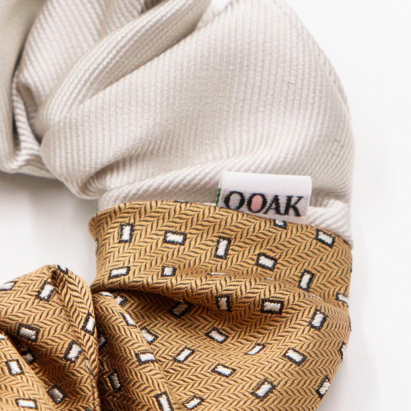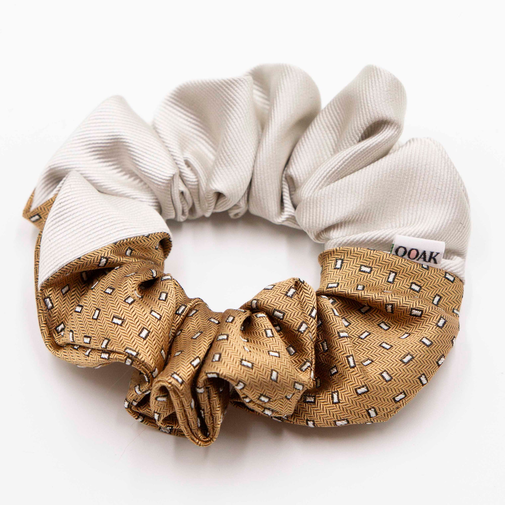 Deze fijne colorblock scrunchie is gemaakt van twee preloved stropdassen en zorgvuldig met de hand afgewerkt.