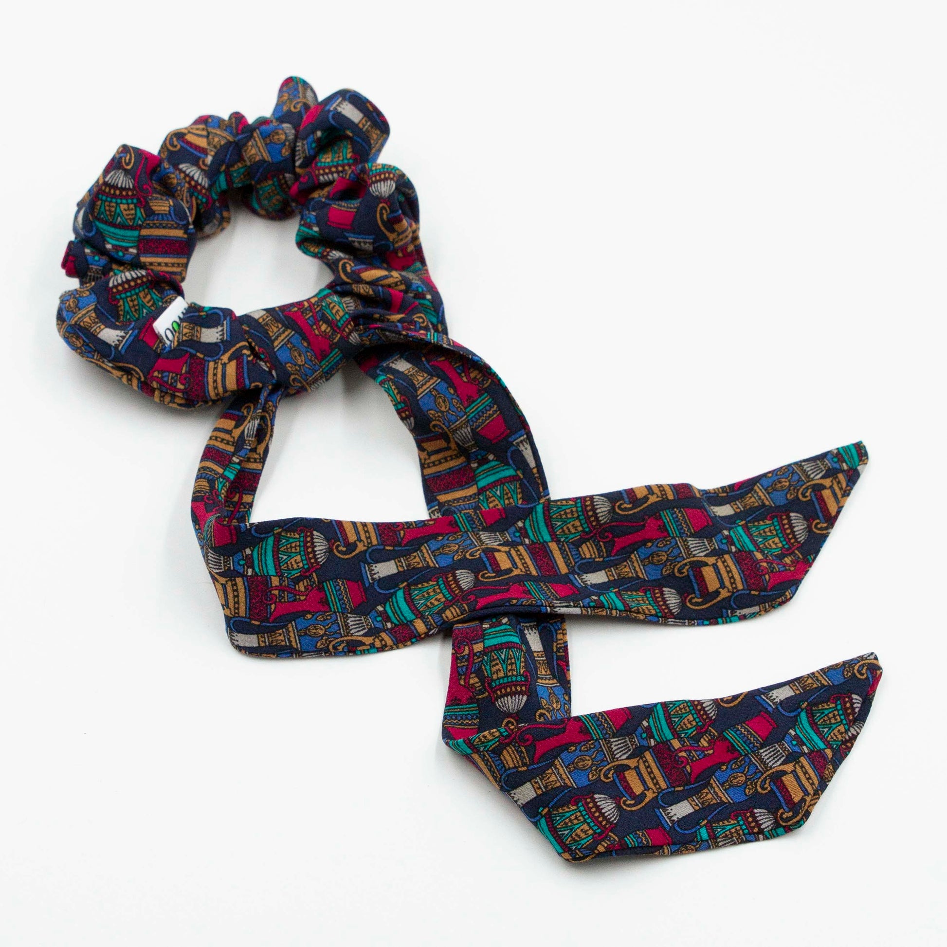 Deze fijne scrunchie met lint is gemaakt van een preloved stropdas en zorgvuldig met de hand afgewerkt.