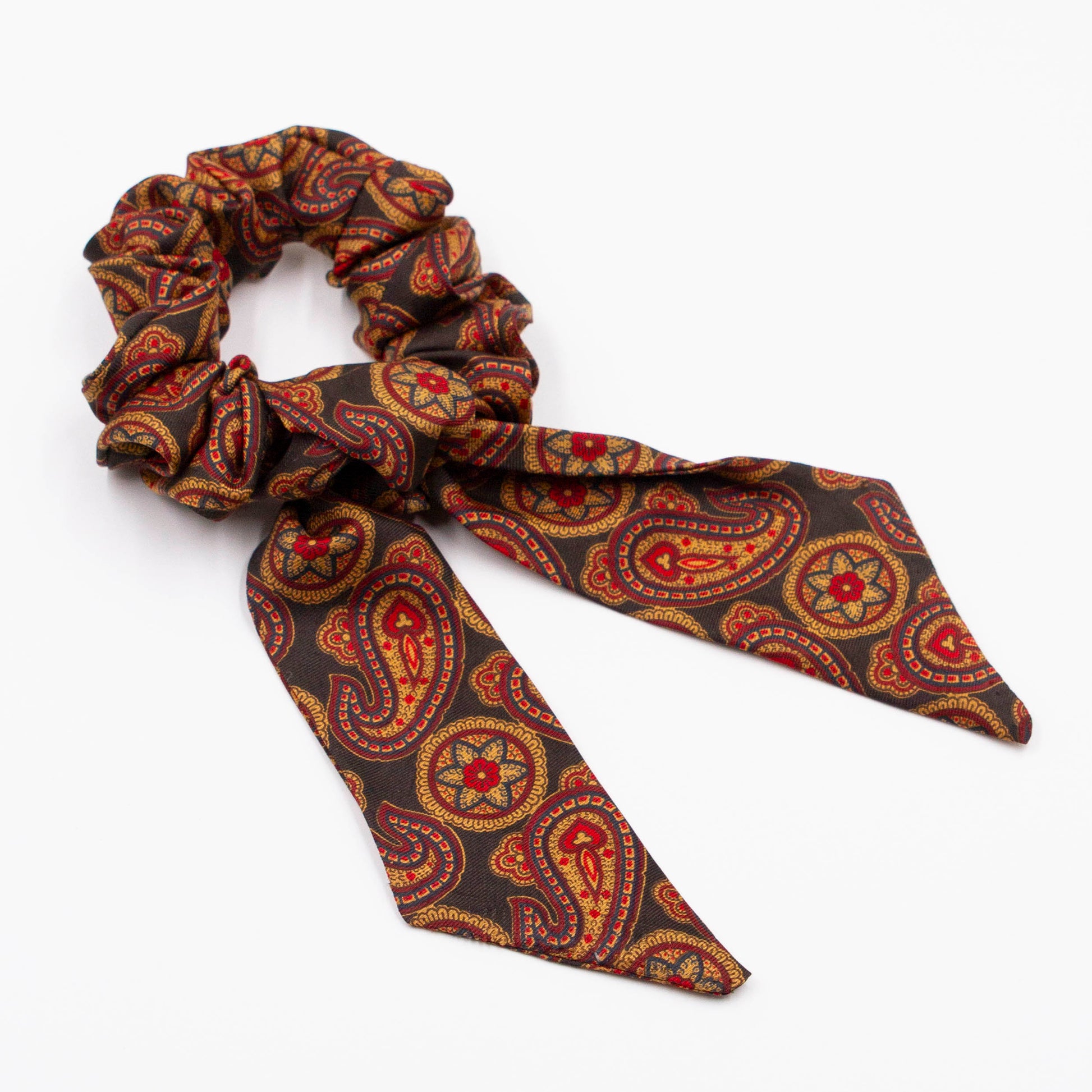 Deze fijne scrunchie met lint is gemaakt van een preloved stropdas en zorgvuldig met de hand afgewerkt.