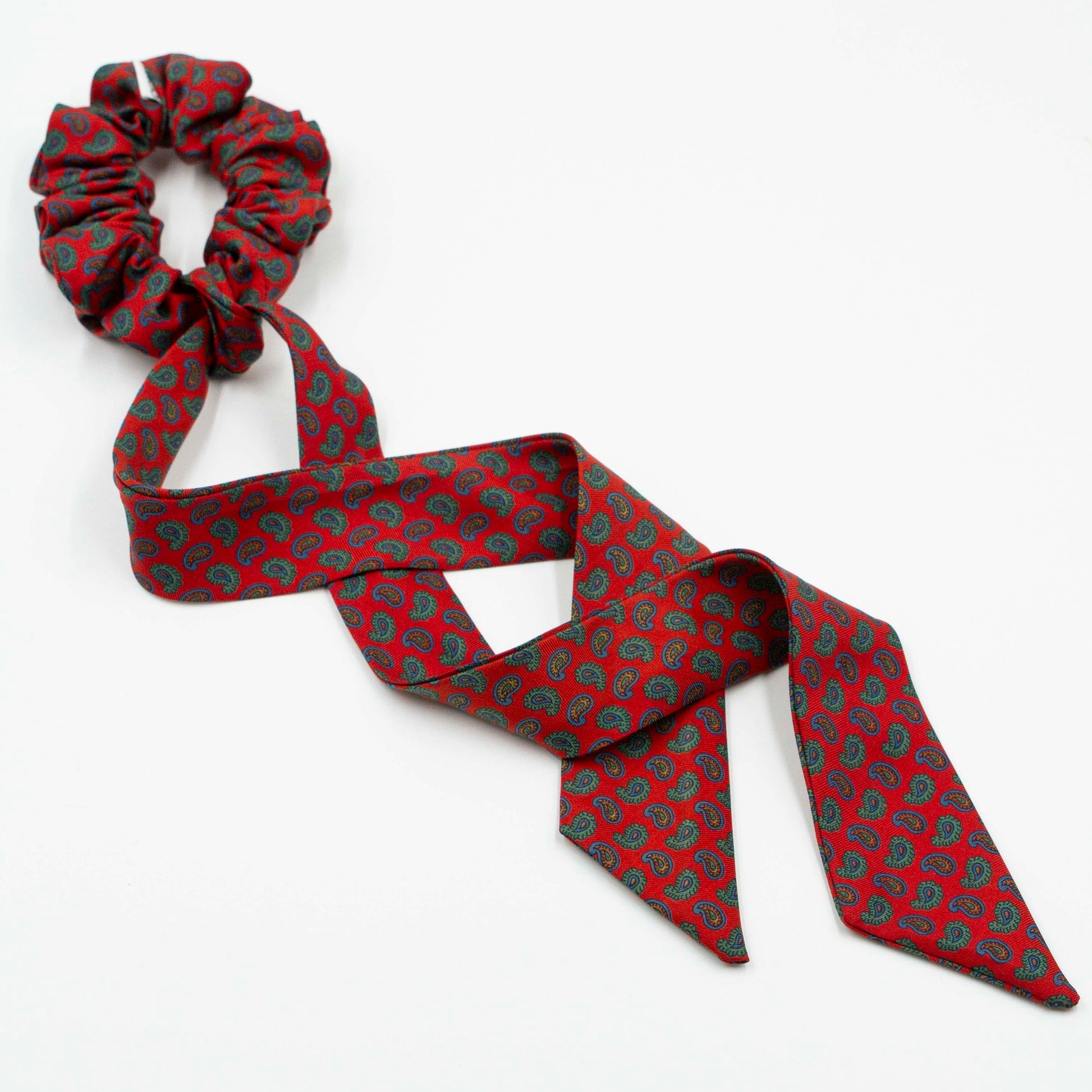 Deze fijne scrunchie met lint is gemaakt van een preloved stropdas en zorgvuldig met de hand afgewerkt.