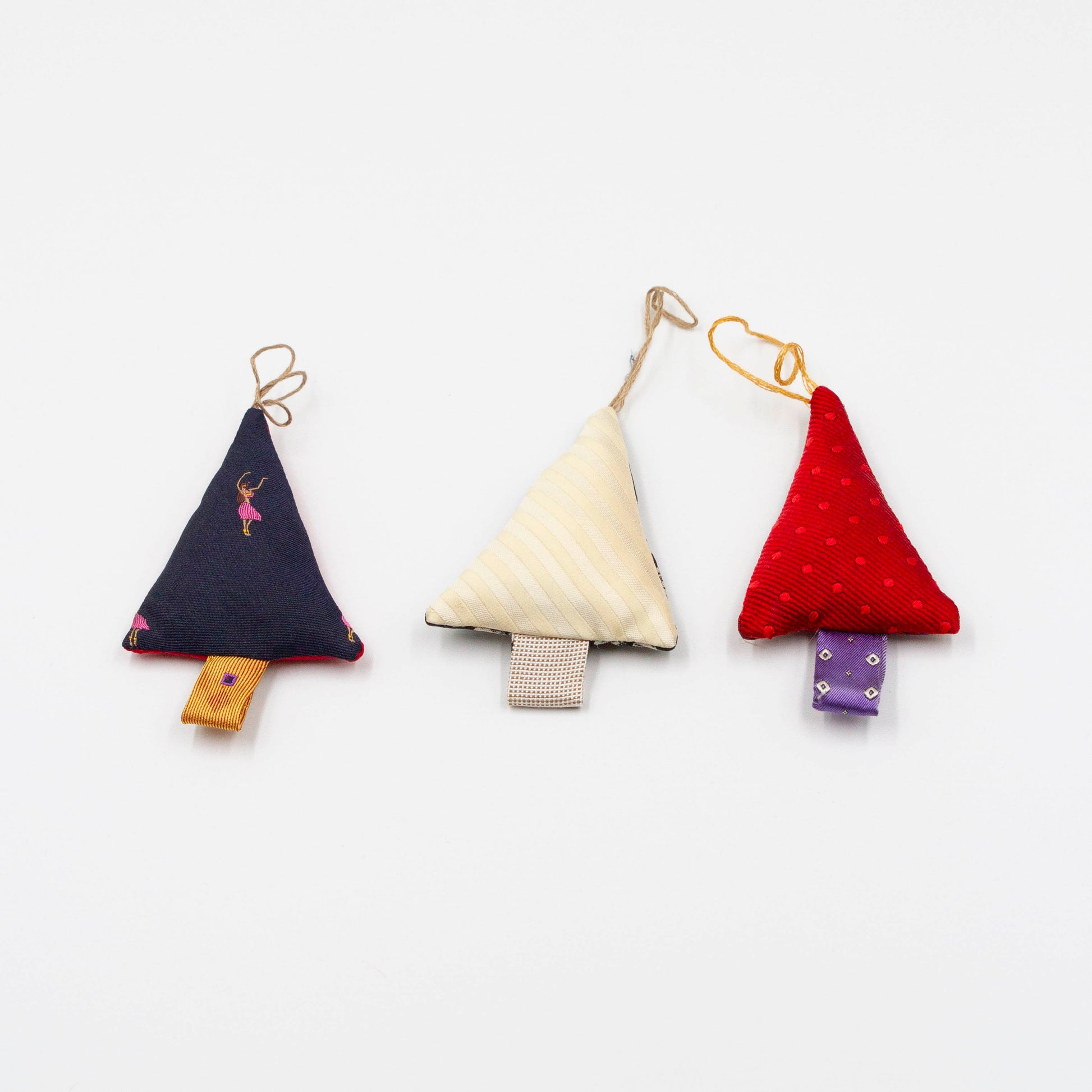 Dit leuke setje kersthangers is gemaakt van restjes stropdasstof welke overblijven na het maken van onze andere producten.